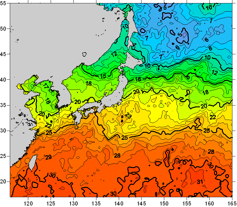 o 2008년 06월 19일 북서태평양 광역해양 수온분포 입니다. o 아래 위성 수온분포도는 국립수산과학원(NFRDI, Korea)과 일본동북대학교(Tohoku University, Japan)가 공동연구개발 진행중, 1차 연구결과인 것으로 구름의 영향을 배제한 신기술의 수온정보입니다.