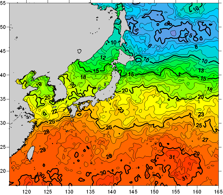 o 2008년 06월 20일 북서태평양 광역해양 수온분포 입니다. o 아래 위성 수온분포도는 국립수산과학원(NFRDI, Korea)과 일본동북대학교(Tohoku University, Japan)가 공동연구개발 진행중, 1차 연구결과인 것으로 구름의 영향을 배제한 신기술의 수온정보입니다.