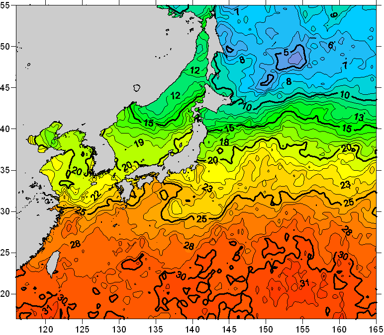 o 2008년 06월 23일 북서태평양 광역해양 수온분포 입니다. o 아래 위성 수온분포도는 국립수산과학원(NFRDI, Korea)과 일본동북대학교(Tohoku University, Japan)가 공동연구개발 진행중, 1차 연구결과인 것으로 구름의 영향을 배제한 신기술의 수온정보입니다.