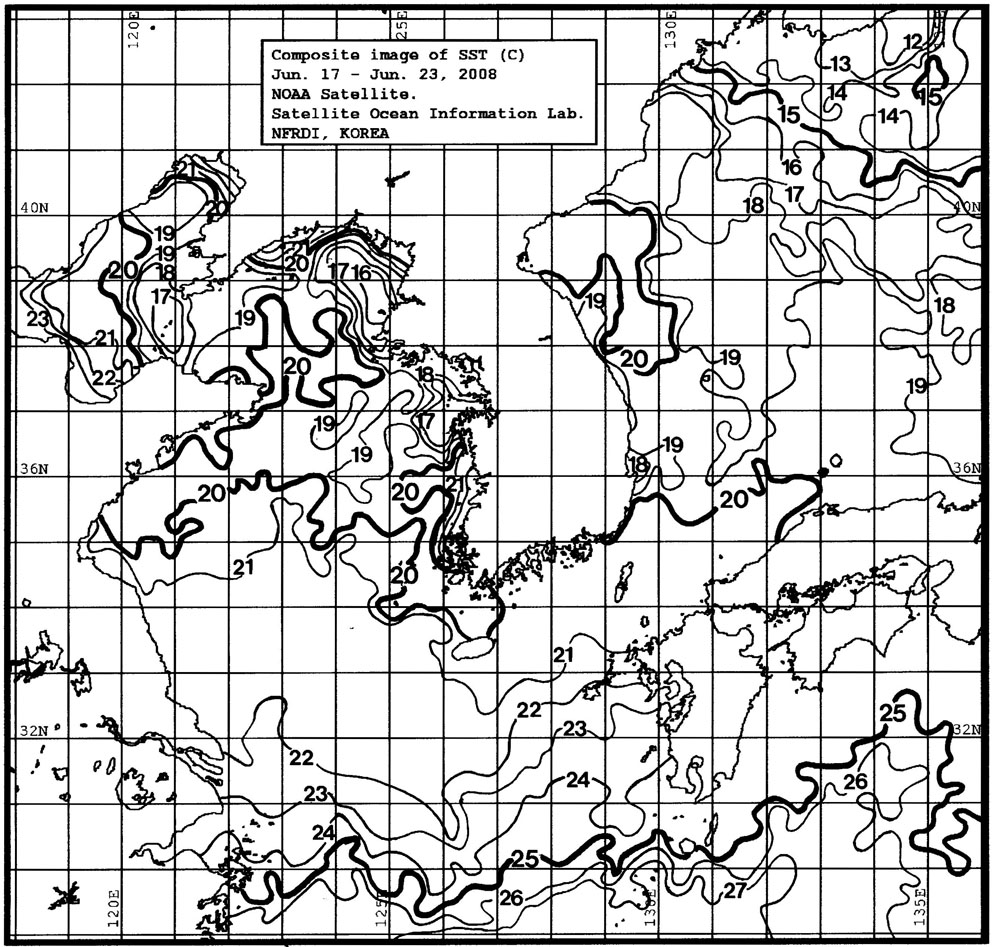 o 금주(2008.06.17~2008.06.23)의 한국근해 표면수온은 대화퇴 근해 17~18도, 울릉도 근해 18~20도, 대마도 근해 20~21도, 제주도 근해 19~21도, 이어도 근해 20~22도, 가거초 근해 18~20도, 어청도 근해 20~21도 내외로 나타납니다. o「평년에 비해」대화퇴 근해 비슷하게, 울릉도 근해 1도 높게, 대마도 근해 0.5도 낮게, 제주도 근해 비슷하게, 이어도 근해 0.5도 높게, 가거초 근해 1도 높게, 어청도 근해는 2도 높게 나타납니다. o「전년에 비해」대화퇴 근해 2.5도 낮게, 울릉도 근해 1.5도 낮게, 대마도 근해 1도 낮게, 제주도 및 이어도 근해 비슷하게, 가거초 근해 0.5도 낮게, 어청도 근해는 2도 높게 나타납니다. o 수온 전선대는 진도 연안 해역에서 20도를 중심으로 형성됩니다. |