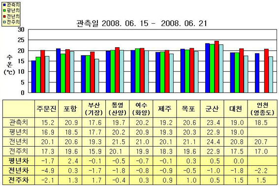 o 금주(2008.06.15~2008.06.21)의 한반도 연안 표면수온은 동해 연안역에서 섭씨 15~21도, 남해 연안역 19~21도, 서해 연안역에서 18~24도 내외로 나타납니다. o 평년에 비해 포항 2도 높음을 제외한 동해 연안역은 0.5~1.5도 낮게, 남해 연안역은 0.5도 낮게, 서해 연안역은 0.5도 높게 나타납니다. o 전년에 비해 포항 0.5도 높음을 제외한 동해 연안역은 1.5~4도 낮게, 남해 연안역은 1~2도 낮게, 서해 연안역은 0.5~2도 낮게 나타납니다.