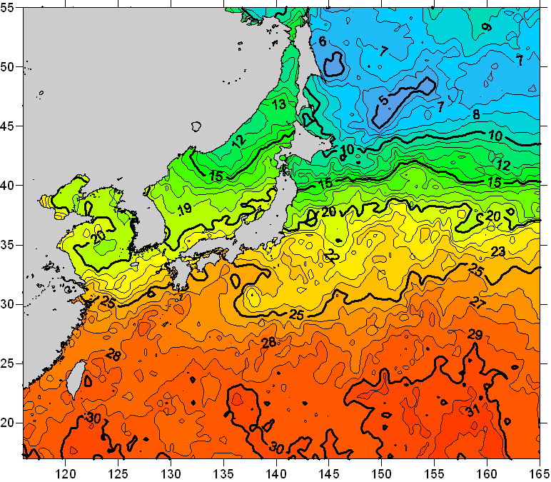 o 2008년 06월 24일 북서태평양 광역해양 수온분포 입니다. o 아래 위성 수온분포도는 국립수산과학원(NFRDI, Korea)과 일본동북대학교(Tohoku University, Japan)가 공동연구개발 진행중, 1차 연구결과인 것으로 구름의 영향을 배제한 신기술의 수온정보입니다.