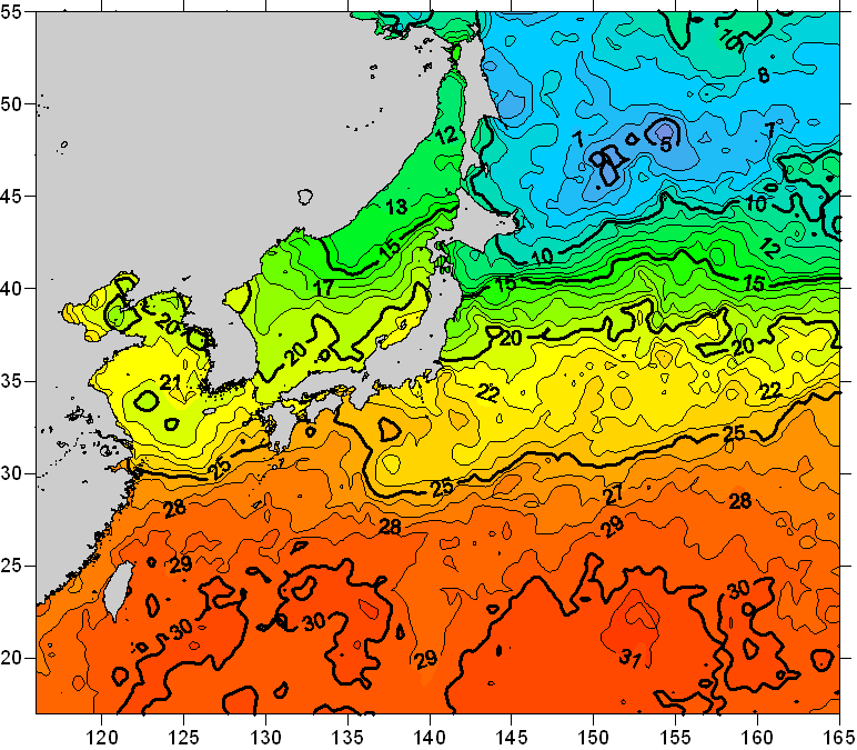 o 2008년 06월 26일 북서태평양 광역해양 수온분포 입니다. o 아래 위성 수온분포도는 국립수산과학원(NFRDI, Korea)과 일본동북대학교(Tohoku University, Japan)가 공동연구개발 진행중, 1차 연구결과인 것으로 구름의 영향을 배제한 신기술의 수온정보입니다.