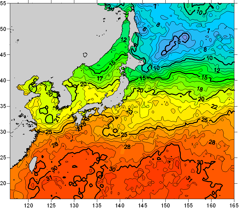 o 2008년 06월 27일 북서태평양 광역해양 수온분포 입니다. o 아래 위성 수온분포도는 국립수산과학원(NFRDI, Korea)과 일본동북대학교(Tohoku University, Japan)가 공동연구개발 진행중, 1차 연구결과인 것으로 구름의 영향을 배제한 신기술의 수온정보입니다.