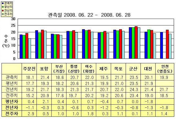 o 금주(2008.06.22~2008.06.28)의 한반도 연안 표면수온은 동해 연안역에서 섭씨 18~22도, 남해 연안역 19~22도, 서해 연안역에서 20~24도 내외로 나타납니다. o 평년에 비해 동해 연안역은 0.5~2도 높게, 제주 0.5도 낮음을 제외한 남해 연안역은 0.5도 높게, 목포 0.5도 높음 및 군산 비슷함을 제외한 서해 연안역은 1.5도 낮게 나타납니다. o 전년에 비해 부산 0.5도 높음을 제외한 동해 연안역은 0.5~1도 낮게, 여수 0.5도 높음을 제외한 남해 연안역은 0.5~1도 낮게, 서해 연안역은 0.5~2도 낮게 나타납니다.