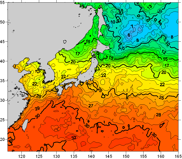 o 2008년 07월 04일 북서태평양 광역해양 수온분포 입니다. o 아래 위성 수온분포도는 국립수산과학원(NFRDI, Korea)과 일본동북대학교(Tohoku University, Japan)가 공동연구개발 진행중, 1차 연구결과인 것으로 구름의 영향을 배제한 신기술의 수온정보입니다.