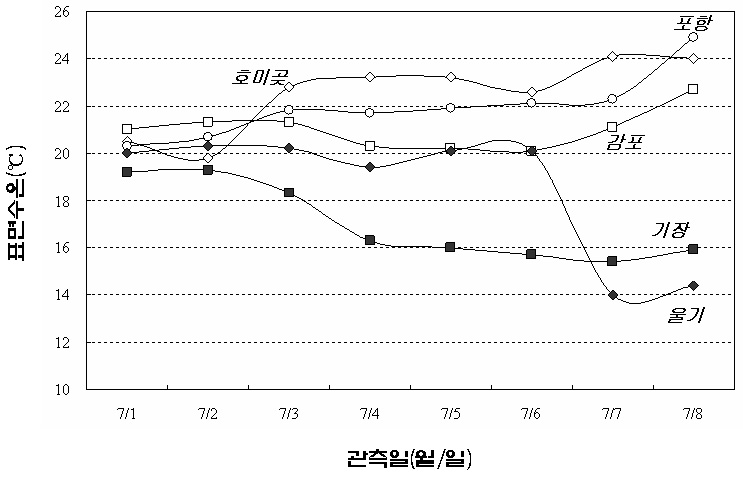 o 2008년 7월 8일자로 기장-울기 연안에 냉수대 주의보를 발령합니다. o 아래 그림은 2007년 7월 1일에서 7월 8일까지 매일 오전 10시에 관측된 현장 표면수온 분포입니다. o 2008년 7월 8일 오전 10시 현재 연안의 표면 수온은 기장 15.9도, 울기 14.4도로 주변해역 감포 (22.7도), 포항(24.9도) 및 호미곶(24도)에 비해 5도 도 이상 낮게 나타납니다. o 냉수대가 발생한 해역의 양식어업인, 조업인 및 해수욕객은 급격한 수온변동에 유의하여 주시고 짙은 안개로 인한 선박운항에도 안전을 기하여 주시기 바랍니다.
