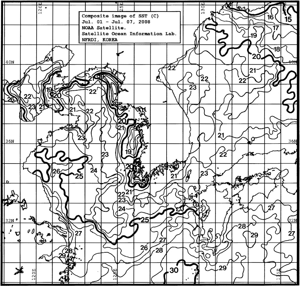 o 금주(2008.07.01~2008.07.07)의 한국근해 표면수온은 대화퇴 근해 19~21도, 울릉도 근해 20~22도, 대마도 근해 21~23도, 제주도 근해 21~24도, 이어도 근해 22~24도, 가거초 근해 22~24도, 어청도 근해 18~20도 내외로 나타납니다. o「평년에 비해」대화퇴 근해 0.5도 낮게, 울릉도 및 대마도 근해 비슷하게, 제주도 근해 0.5도 낮게, 이어도 근해 2도 낮게, 가거초 근해 0.5도 높게, 어청도 근해는 3도 낮게 나타납니다. o「전년에 비해」대화퇴 근해 0.5도 낮게, 울릉도 근해 2도 낮게, 대마도, 제주도 및 이어도 근해 1도 낮게, 가거초 근해 비슷하게, 어청도 근해는 4도 낮게 나타납니다. o 수온 전선대는 진도 연안 해역에서 19도를 중심으로 형성됩니다.