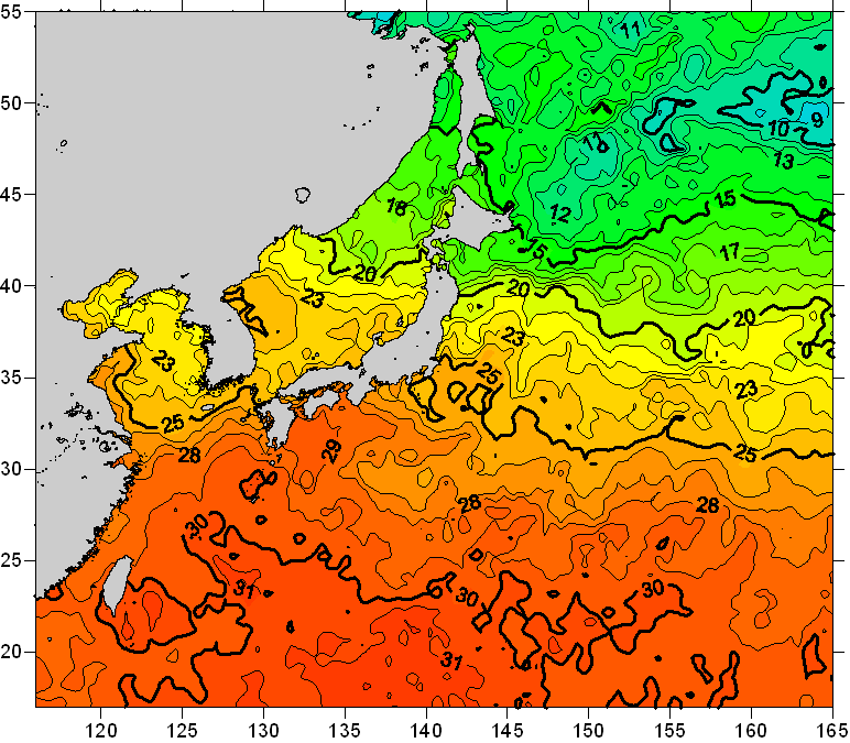 o 2008년 07월 08일 북서태평양 광역해양 수온분포 입니다. o 아래 위성 수온분포도는 국립수산과학원(NFRDI, Korea)과 일본동북대학교(Tohoku University, Japan)가 공동연구개발 진행중, 1차 연구결과인 것으로 구름의 영향을 배제한 신기술의 수온정보입니다.