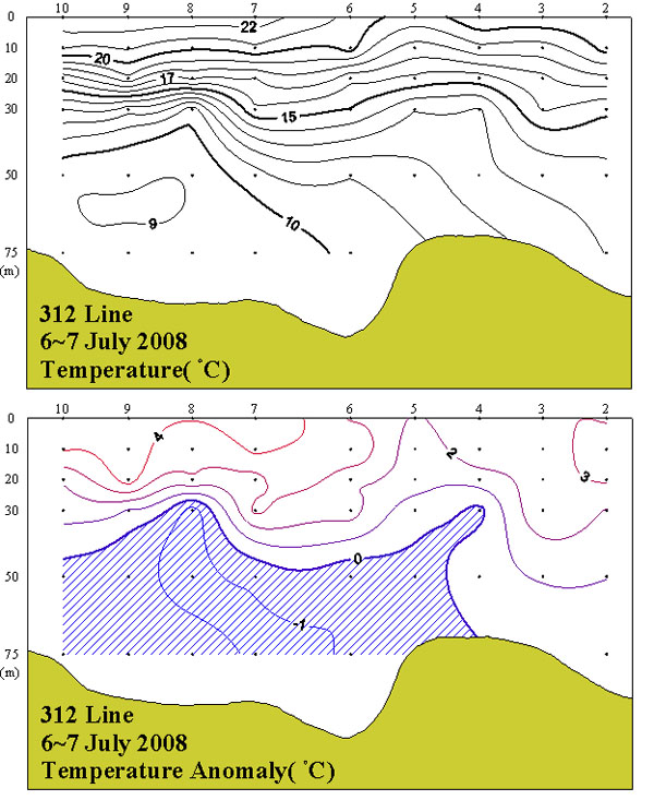 ㅇ 2008년 7월 6~7일 국립수산과학원 서해수산연구소에서 조사한 312선(제주해협 서방)의 수직수온분포도 및 평년편차도입니다. ㅇ 수온약층은 외해에서는 수심 20~40m 수층에 17℃를 중심으로 강하게 형성되었으며 연안에서는 외해애 비해 약하게 형성되었습니다. ㅇ 평년에 비하여 표층부근은 1~4℃내외의 고온상을 보인 반면, 저층 부근은 1℃내외의 저온상을 나타내었습니다.