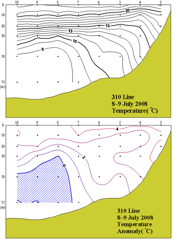 ㅇ 2008년 7월 8~9일 국립수산과학원 서해수산연구소에서 조사한 310선 (영광 서방)의 수직수온분포도 및 평년편차도입니다. ㅇ 수온약층은 외해에서는 20~40m 수층에 15℃를 중심으로 강하게 형성되었으며 연안쪽으로 올수록 수온약층이 약하게 형성되었습니다. ㅇ 평년에 비하여 외해 50m 아래층을 제외한 대부분의 해역에서 1~4℃의 고온상을 나타내었습니다.