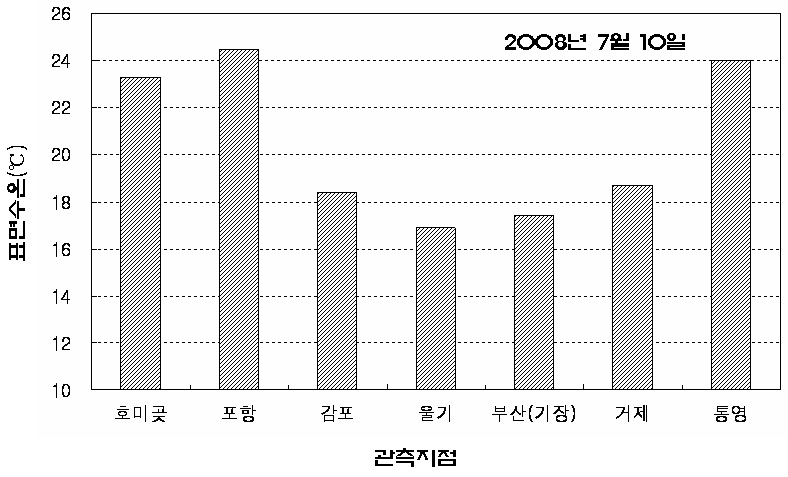 o 2008년 7월 10일자로 거제 및 감포 연안에 냉수대 주의보를 발령합니다. 앞서 7월 8일자로 발령된 기장-울기간 냉수대 주의보도 유효합니다. o 아래 그림은 2008년 7월 10일 오전 10시에 관측된 현장 표면수온 분포입니다. o 2008년 7월 10일 오전 10시 현재 연안의 표면 수온은 감포 18.4도, 울기 16.9도, 부산(기장) 17.4도, 거제 18.7도로 주변해역 호미곶(23.3도), 포항(24.5도) 및 통영(24도)에 비해 5도 이상 낮게 나타납니다. o 냉수대가 발생한 해역의 양식어업인, 조업인 및 해수욕객은 급격한 수온변동에 유의하여 주시고 짙은 안개로 인한 선박운항에도 안전을 기하여 주시기 바랍니다.