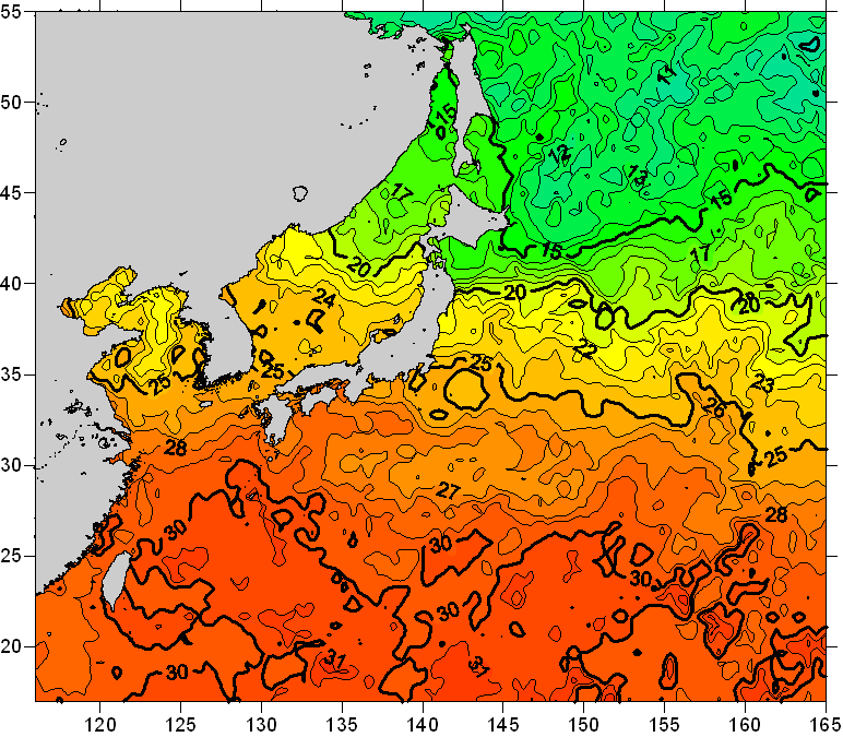 o 2008년 07월 09일 북서태평양 광역해양 수온분포 입니다. o 아래 위성 수온분포도는 국립수산과학원(NFRDI, Korea)과 일본동북대학교(Tohoku University, Japan)가 공동연구개발 진행중, 1차 연구결과인 것으로 구름의 영향을 배제한 신기술의 수온정보입니다.