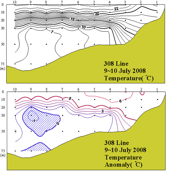 ㅇ2008년 7월 9~10일 현지 국립수산과학원 서해수산연구소에서 조사한 308선(대천 서방)의 수직수온분포도 및 평년편차도입니다. ㅇ수온약층은 10~30m 부근에서 15℃를 중심으로 강하게 형성되었고 외해역에서 보다 강하게 형성되었습니다. ㅇ 평년에 비하여 외해역의 20m 아래층을 제외한 대부분의 해역에서 1~6℃의 고온상을 나타내었습니다.