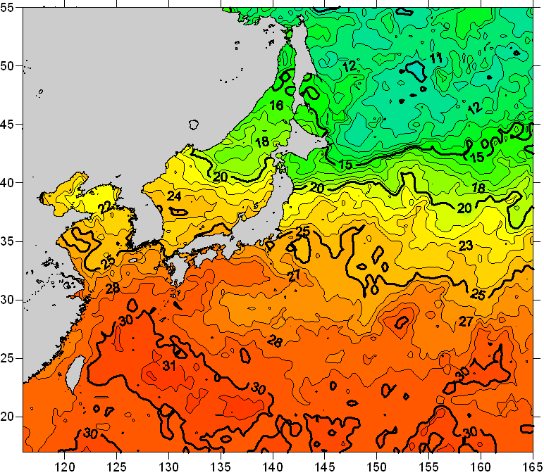 o 2008년 07월 11일 북서태평양 광역해양 수온분포 입니다. o 아래 위성 수온분포도는 국립수산과학원(NFRDI, Korea)과 일본동북대학교(Tohoku University, Japan)가 공동연구개발 진행중, 1차 연구결과인 것으로 구름의 영향을 배제한 신기술의 수온정보입니다.