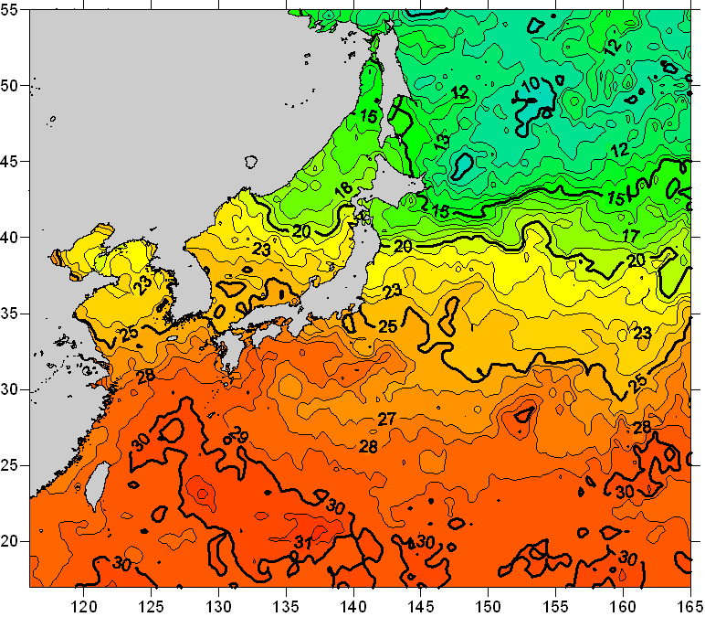 o 2008년 07월 12일 북서태평양 광역해양 수온분포 입니다. o 아래 위성 수온분포도는 국립수산과학원(NFRDI, Korea)과 일본동북대학교(Tohoku University, Japan)가 공동연구개발 진행중, 1차 연구결과인 것으로 구름의 영향을 배제한 신기술의 수온정보입니다.