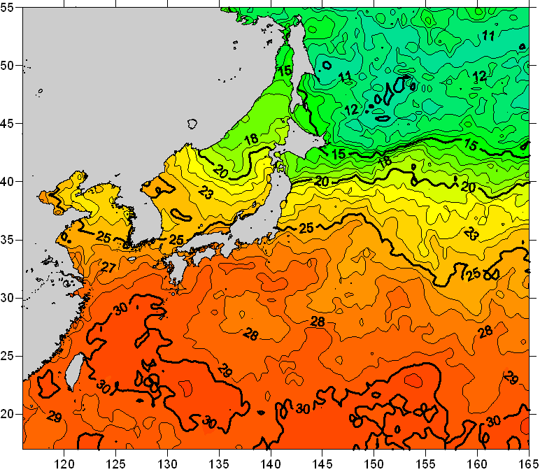 o 2008년 07월 14일 북서태평양 광역해양 수온분포 입니다. o 아래 위성 수온분포도는 국립수산과학원(NFRDI, Korea)과 일본동북대학교(Tohoku University, Japan)가 공동연구개발 진행중, 1차 연구결과인 것으로 구름의 영향을 배제한 신기술의 수온정보입니다.