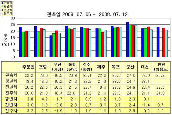 o 금주(2008.07.06~2008.07.12)의 한반도 연안 표면수온은 동해 연안역에서 섭씨 17~24도, 남해 연안역 22~24도, 서해 연안역에서 22~27도 내외로 나타납니다. o 평년에 비해 부산 1.5도 낮음을 제외한 동해 연안역은 3~4도 높게, 제주 비슷함을 제외한 남해 연안역은 1~2도 높게, 대천 비슷함을 제외한 서해 연안역은 1~2도 높게 나타납니다. o 전년에 비해 부산 3.5도 낮음을 제외한 동해 연안역은 1~3도 높게, 남해 연안역은 0.5~3도 높게, 대천 1.5도 낮음을 제외한 서해 연안역은 0.5~2도 높게 나타납니다.