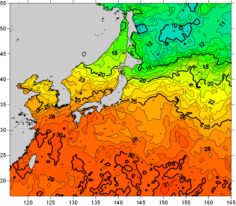o 2008년 07월 16일 북서태평양 광역해양 수온분포 입니다. o 아래 위성 수온분포도는 국립수산과학원(NFRDI, Korea)과 일본동북대학교(Tohoku University, Japan)가 공동연구개발 진행중, 1차 연구결과인 것으로 구름의 영향을 배제한 신기술의 수온정보입니다.