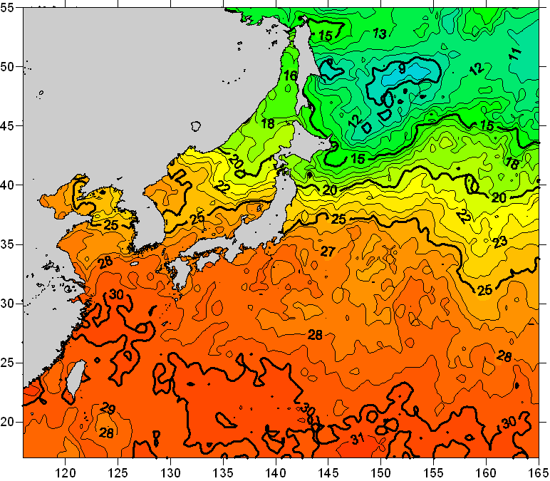 o 2008년 07월 17일 북서태평양 광역해양 수온분포 입니다. o 아래 위성 수온분포도는 국립수산과학원(NFRDI, Korea)과 일본동북대학교(Tohoku University, Japan)가 공동연구개발 진행중, 1차 연구결과인 것으로 구름의 영향을 배제한 신기술의 수온정보입니다.