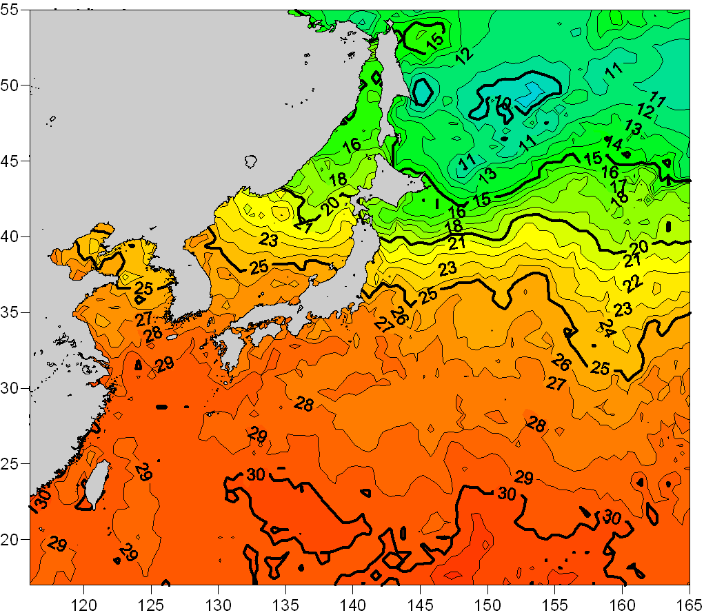 o 2008년 07월 18일 북서태평양 광역해양 수온분포 입니다. o 아래 위성 수온분포도는 국립수산과학원(NFRDI, Korea)과 일본동북대학교(Tohoku University, Japan)가 공동연구개발 진행중, 1차 연구결과인 것으로 구름의 영향을 배제한 신기술의 수온정보입니다.