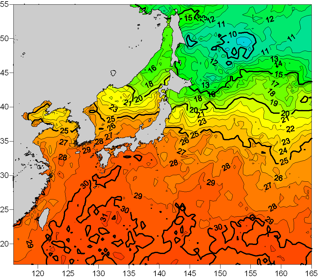 o 2008년 07월 19일 북서태평양 광역해양 수온분포 입니다. o 아래 위성 수온분포도는 국립수산과학원(NFRDI, Korea)과 일본동북대학교(Tohoku University, Japan)가 공동연구개발 진행중, 1차 연구결과인 것으로 구름의 영향을 배제한 신기술의 수온정보입니다.