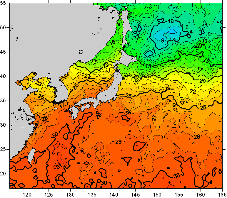 o 2008년 07월 21일 북서태평양 광역해양 수온분포 입니다. o 아래 위성 수온분포도는 국립수산과학원(NFRDI, Korea)과 일본동북대학교(Tohoku University, Japan)가 공동연구개발 진행중, 1차 연구결과인 것으로 구름의 영향을 배제한 신기술의 수온정보입니다.
