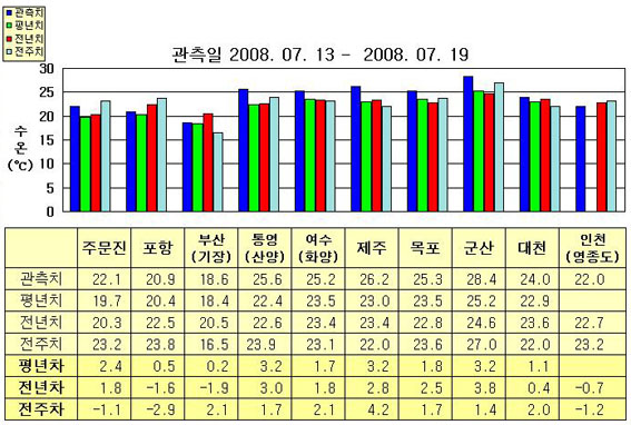 o 금주(2008.07.13~2008.07.19)의 한반도 연안 표면수온은 동해 연안역에서 섭씨 18~23도, 남해 연안역 25~27도, 서해 연안역에서 22~29도 내외로 나타납니다. o 평년에 비해 부산 비슷함을 제외한 동해 연안역은 0.5~2.5도 높게, 남해 연안역은 2~3.5도 높게, 서해 연안역은 1~3도 높게 나타납니다. o 전년에 비해 주문진 2도 높음을 제외한 동해 연안역은 1.5~2도 낮게, 남해 연안역은 2~3도 높게, 인천 0.5도 낮음을 제외한 서해 연안역은 0.5~4도 높게 나타납니다.
