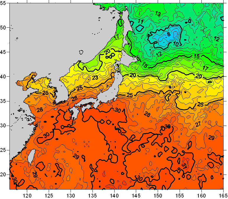 o 2008년 07월 27일 북서태평양 광역해양 수온분포 입니다. o 아래 위성 수온분포도는 국립수산과학원(NFRDI, Korea)과 일본동북대학교(Tohoku University, Japan)가 공동연구개발 진행중, 1차 연구결과인 것으로 구름의 영향을 배제한 신기술의 수온정보입니다.
