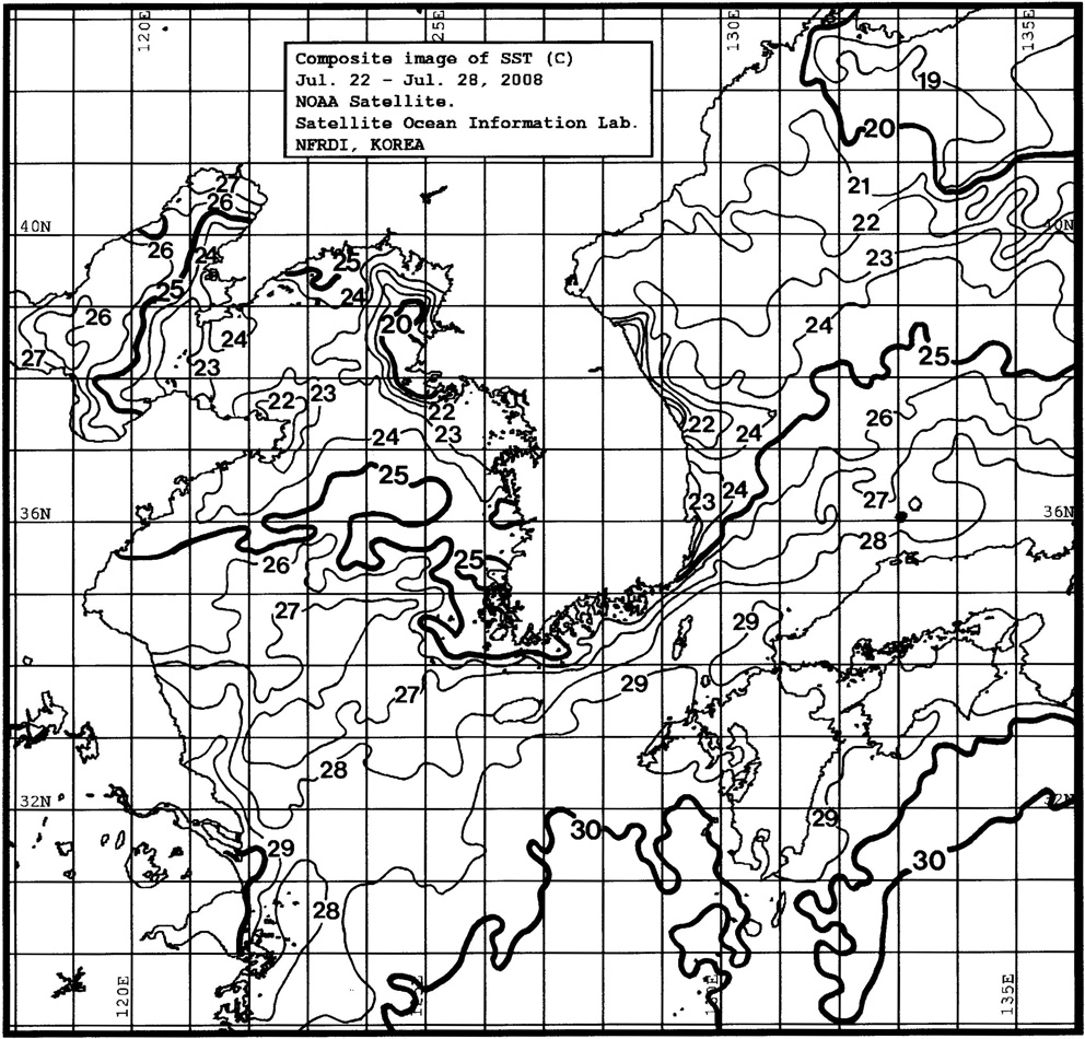 o 금주(2008.07.22~2008.07.28)의 한국근해 표면수온은 대화퇴 근해 22~25도, 울릉도 근해 23~25도, 대마도 근해 28~29도, 제주도 근해 27~29도, 이어도 근해 28~29도, 가거초 근해 26~27도, 어청도 근해 24~25도 내외로 나타납니다.