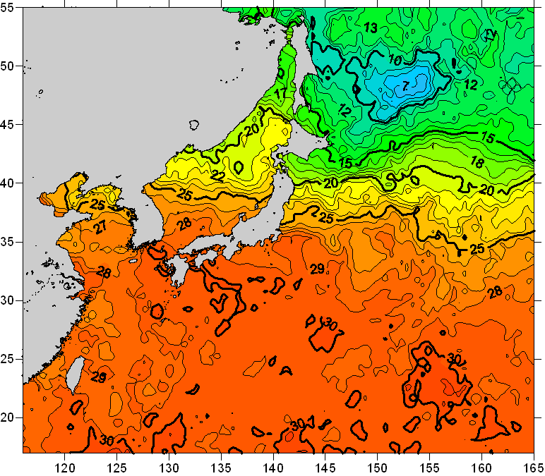 o 2008년 07월 29일 북서태평양 광역해양 수온분포 입니다. o 아래 위성 수온분포도는 국립수산과학원(NFRDI, Korea)과 일본동북대학교(Tohoku University, Japan)가 공동연구개발 진행중, 1차 연구결과인 것으로 구름의 영향을 배제한 신기술의 수온정보입니다.