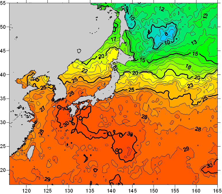 o 2008년 07월 30일 북서태평양 광역해양 수온분포 입니다. o 아래 위성 수온분포도는 국립수산과학원(NFRDI, Korea)과 일본동북대학교(Tohoku University, Japan)가 공동연구개발 진행중, 1차 연구결과인 것으로 구름의 영향을 배제한 신기술의 수온정보입니다.