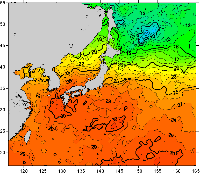 o 2008년 08월 01일 북서태평양 광역해양 수온분포 입니다. o 아래 위성 수온분포도는 국립수산과학원(NFRDI, Korea)과 일본동북대학교(Tohoku University, Japan)가 공동연구개발 진행중, 1차 연구결과인 것으로 구름의 영향을 배제한 신기술의 수온정보입니다.