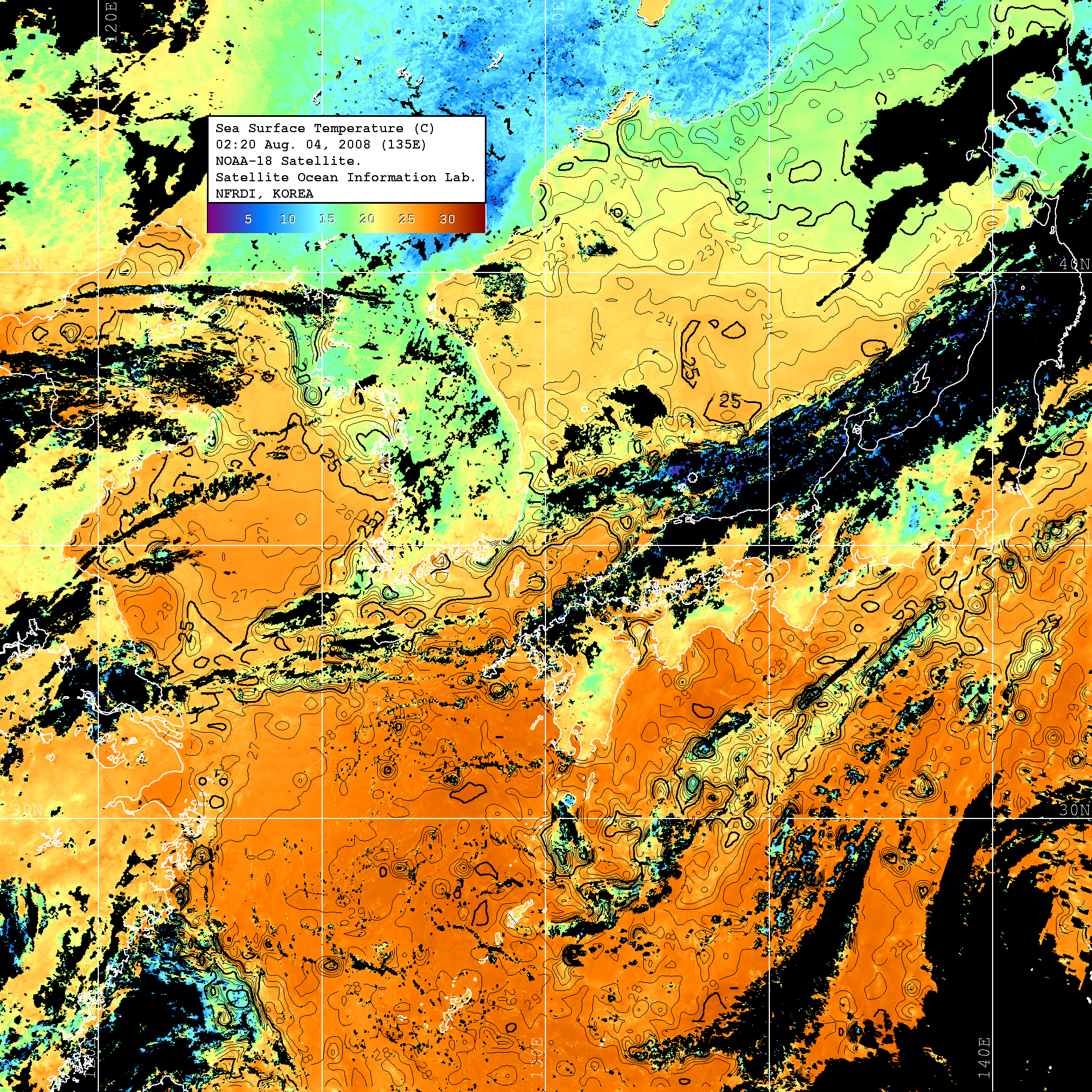 o 2008년 08월 04일 02시 20분 NOAA-18호 위성영상입니다. o 수온분포는 범례를 참고하시기 바랍니다.