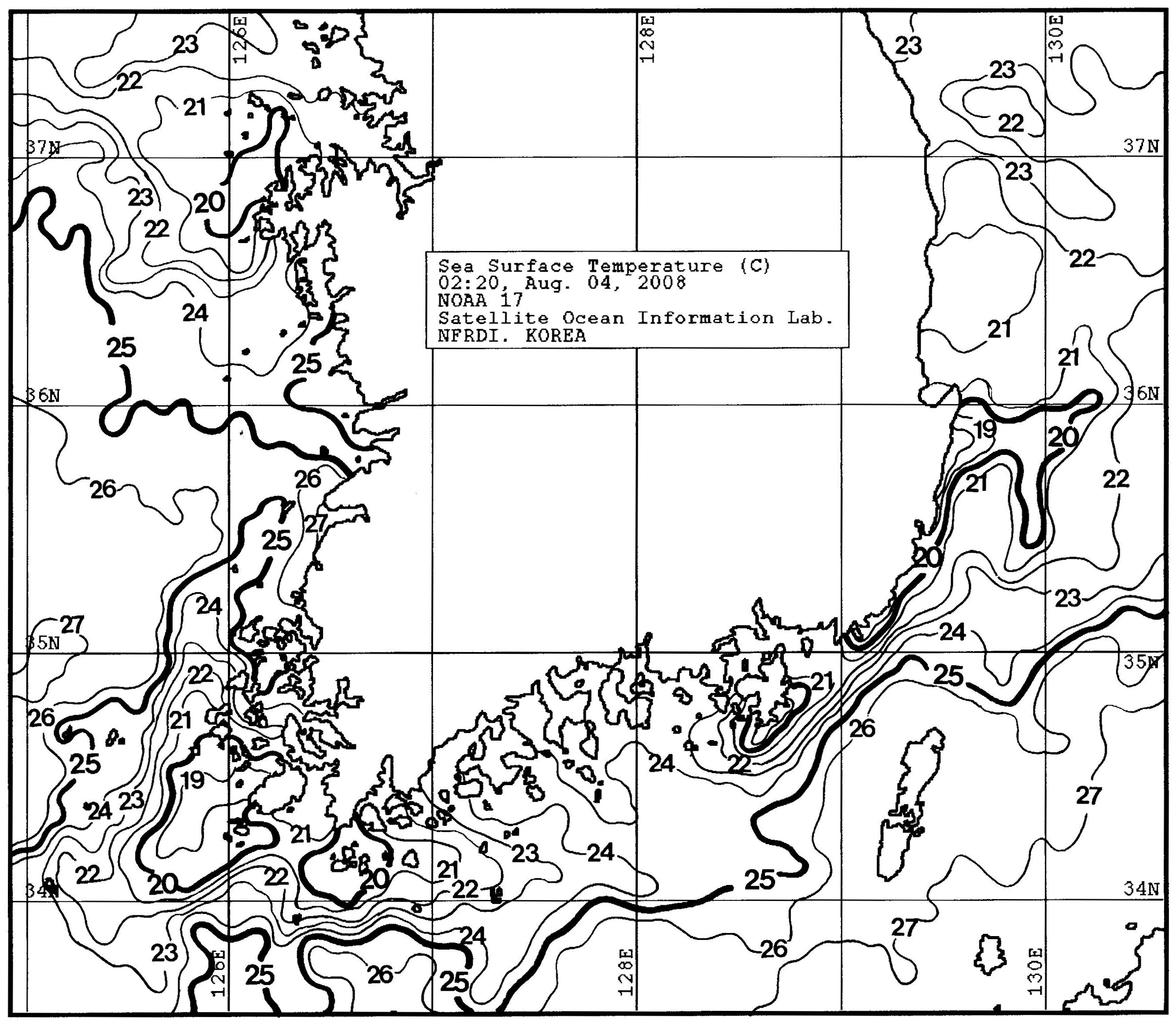 - 현장 관측 표면수온은 거제 17도, 기장 15.4도, 울기 16.2도로 주변 외해 수온(26도)에 비해 약 10도 내외로 차갑게 나타납니다. 어제 발령된 거제 및 기장연안 냉수대 경보도 유효합니다. - 아래 그림은 2008년 8월 4일 02시 20분 현재의 위성 추정 표면수온입니다.