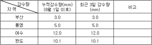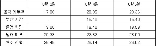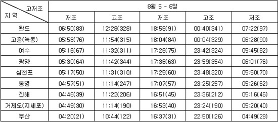 (Aug. 5. 2008) 2. 기상전망 (기상청 예보 자료) * 바람 및 파고 전망 오늘 남해서부에서 바람은 서풍 내지 북서풍이 2~5m/sec, 파고는 0.5m 내외로 예상되며, 남해동부에서는 북동풍 내지 남동풍이 5~7m/sec, 파고는 0.5m로 예상됨. 내일은 남해서부에서 바람은 서풍 내지 북서풍이 2~5m/sec, 파고는 0.5m 내외로 예상되며, 남해동부에서 바람은 북동풍 내지 남동풍이 5~7m/sec, 파고는 0.5m로 예상됨. * 특보 발효 현황 ㅇ 폭염주의보: 경기도(포천시, 가평군, 수원시, 성남시, 구리시, 남양주시, 오산시, 평택 시, 하남시, 용인시, 이천시, 안성시, 여주군, 광주시, 양평군), 충청남도(공주시, 논산 시, 금산군, 계룡시), 충청북도(괴산군, 충주시, 제천시, 단양군), 전라남도(나주시, 곡 성군, 구례군, 화순군, 광양시, 순천시, 영암군, 함평군, 진도군), 전라북도(김제시, 완 주군, 순창군, 정읍시), 경상북도(구미시, 영천시, 고령군, 성주군, 김천시, 상주시, 문 경시, 예천군, 안동시, 영주시, 의성군, 청송군), 경상남도(마산시, 진해시, 김해시, 진 주시, 하동군, 산청군, 거창군, 사천시, 고성군), 대전광역시, 대구광역시 ㅇ 폭염경보: 경상북도(경산시, 군위군, 청도군, 칠곡군), 경상남도(창원시, 밀양시, 의령 군, 함안군, 창녕군, 함양군, 합천군) * 강수량 3. 조석 및 해수유동 전망 * 지역별 조석상황