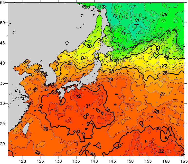 o 2008년 08월 04일 북서태평양 광역해양 수온분포 입니다. o 아래 위성 수온분포도는 국립수산과학원(NFRDI, Korea)과 일본동북대학교(Tohoku University, Japan)가 공동연구개발 진행중, 1차 연구결과인 것으로 구름의 영향을 배제한 신기술의 수온정보입니다.