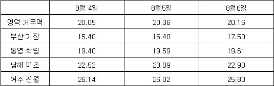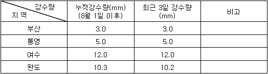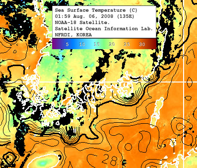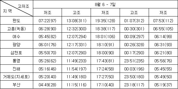 1. 수온 정보 * 연안 수온 정보 (10시 기준) * 인공위성 남해 광역표면수온 정보 (Aug. 6. 2008) 2. 기상전망 (기상청 예보 자료) * 바람 및 파고 전망 오늘 남해서부에서 바람은 서풍 내지 북서풍이 2~5m/sec, 파고는 0.5m 내외로 예상되며, 남해동부에서는 북서풍 내지 북동풍이 3~5m/sec, 파고는 0.5m로 예상됨. 내일은 남해서부에서 바람은 북서풍 내지 북동풍이 2~5m/sec, 파고는 0.5m 내외로 예상되며, 남해동부에서 바람은 북동풍 내지 남동풍이 4~6m/sec, 파고는 0.5~1.0m로 예상됨. * 특보 발효 현황 ㅇ 폭염주의보: 경기도(연천군, 포천시, 가평군, 의정부시, 수원시, 성남시, 구리시, 남양주시, 오산시, 평택시, 하남시, 용인시, 이천시, 안성시, 여주군, 광주시, 양평군), 강원도(영월군, 화천군, 홍천군, 춘천시, 양구군, 인제군), 충청남도(공주시, 논산시, 금산군, 계룡시), 충청북도(청주시, 청원군, 괴산군, 옥천군, 영동군, 충주시, 제천시, 단양군), 전라남도(나주시, 곡성군, 구례군, 화순군, 광양시, 순천시, 영암군, 함평군, 진도군), 전라북도(김제시, 완주군, 순창군, 정읍시), 경상북도(구미시, 영천시, 고령군, 성주군, 김천시, 상주시, 문경시, 예천군, 안동시, 영주시, 의성군, 청송군, 경주시), 경상남도(양산시, 마산시, 진해시, 김해시, 진주시, 하동군, 산청군, 거창군, 사천시, 고성군), 대전광역시 ㅇ 폭염경보: 경상북도(경산시, 군위군, 청도군, 칠곡군), 경상남도(창원시, 밀양시, 의령군, 함안군, 창녕군, 함양군, 합천군), 대구광역시 * 강수량 3. 조석 및 해수유동 전망 * 지역별 조석상황