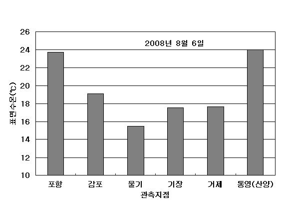 o 2008년 8월 6일 15시를 기해 기장 및 거제 연안의 냉수대 경보를 주의보로 대체발령합니다. 앞서 8월 5일 발령된 울기 연안의 냉수대 경보는 유효합니다.