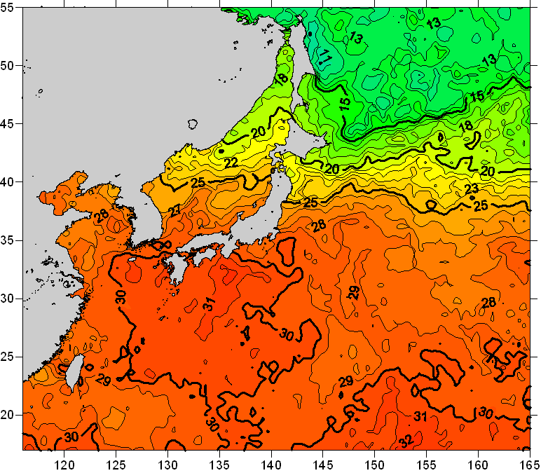 o 2008년 08월 05일 북서태평양 광역해양 수온분포 입니다. o 아래 위성 수온분포도는 국립수산과학원(NFRDI, Korea)과 일본동북대학교(Tohoku University, Japan)가 공동연구개발 진행중, 1차 연구결과인 것으로 구름의 영향을 배제한 신기술의 수온정보입니다.