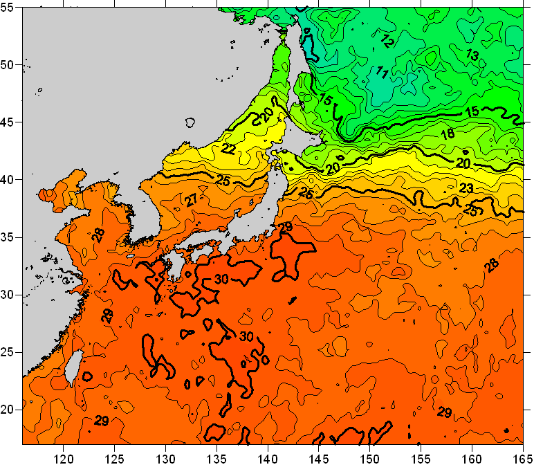 o 2008년 08월 08일 북서태평양 광역해양 수온분포 입니다. o 아래 위성 수온분포도는 국립수산과학원(NFRDI, Korea)과 일본동북대학교(Tohoku University, Japan)가 공동연구개발 진행중, 1차 연구결과인 것으로 구름의 영향을 배제한 신기술의 수온정보입니다.