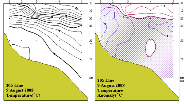 ㅇ 2008년 8월 9일 국립수산과학원 남해수산연구소에서 조사한 205선(소리도 남동방)의 수직수온분포도 및 평년편차도 입니다. ㅇ 수온약층은 20~30m에서 23도를 중심으로 형성되었으며 표층주변에서는 연안쪽에서 높은 수온을 유지하고 있으며, 외양쪽으로 갈수록 낮은 수온을 보였으며, 수온전선의 뚜렷한 위치는 보여지지 않았습니다. ㅇ 평년에 비하여 외양역 표층 주변을 제외한 대부분의 해역에서 1~3℃ 저온상을 나타내었습니다.