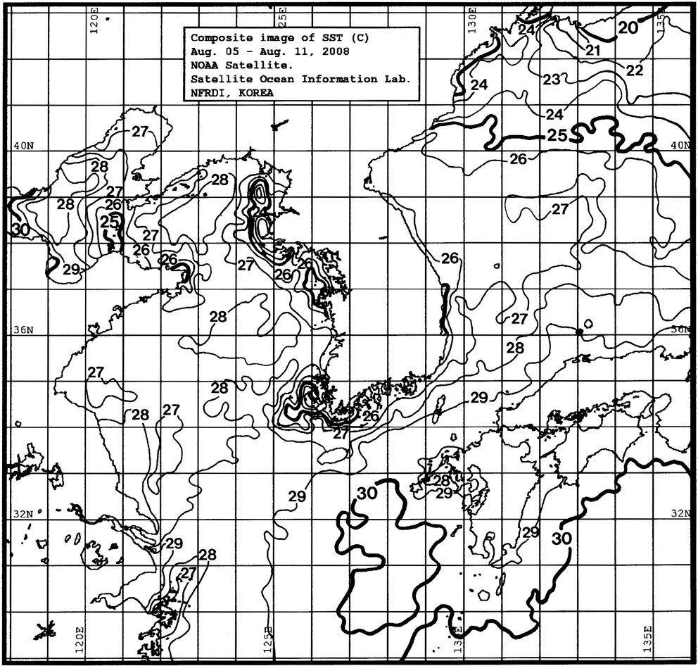 o 금주(2008.08.05~2008.08.11)의 한국근해 표면수온은 대화퇴 근해 24~27도, 울릉도 근해 26~27도, 대마도 근해 28~30도, 제주도 근해 27~29도, 이어도 근해 28~30도, 가거초 근해 27~28도, 어청도 근해 27~28도 내외로 나타납니다.