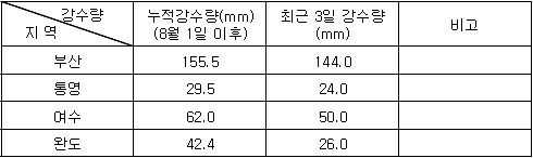 (Aug. 13. 2008) 2. 기상전망 (기상청 예보 자료) * 바람 및 파고 전망 오늘 남해서부에서 바람은 남서풍 내지 서풍이 5~8m/sec, 파고는 0.5~1.0m 내외로 예상되며, 남해동부에서는 남서풍 내지 서풍이 7~11m/sec, 파고는 0.5~1.5m로 예상됨. 내일은 남해서부에서 바람은 북동풍 내지 남동풍이 5~8m/sec, 파고는 0.5~1.0m 내외로 예상되며, 남해동부에서 바람은 남서풍 내지 서풍이 7~11m/sec, 파고는 0.5~1.5m로 예상됨. * 특보 발효 현황 ㅇ 없 음 * 강수량