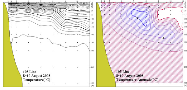 ㅇ 2008년 8월 8~10일 국립수산과학원 동해수산연구소에서 조사한 105선(동해 동방)의 수직수온분포도 및 평년편차도입니다. ㅇ 수온약층은 태양복사열의 증가로 표층주변에 형성되어 표면혼합층의 존재가 나타나지 않았으며, 정점 8~9 사이에서 동한난류의 흐름으로 판단되는 등온선 구조가 보여졌습니다. ㅇ 평년에 비하여 외양역 중층 일부를 제외한 대부분의 해역에서 1~5℃ 저온상을 나타내었습니다.