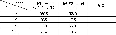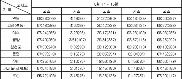 (Aug. 14. 2008) 2. 기상전망 (기상청 예보 자료) * 바람 및 파고 전망 오늘 남해서부에서 바람은 남서풍 내지 서풍이 3~7m/sec, 파고는 0.5~1.0m 내외로 예상되며, 남해동부에서는 남동풍 내지 남서풍이 7~11m/sec, 파고는 0.5~1.5m로 예상됨. 내일은 남해서부에서 바람은 남서풍 내지 서풍이 3~7m/sec, 파고는 0.5~1.0m 내외로 예상되며, 남해동부에서 바람은 남동풍 내지 남서풍이 7~11m/sec, 파고는 0.5~1.5m로 예상됨. * 특보 발효 현황 ㅇ 폭염주의보: 경상북도(구미시, 영천시, 경산시, 군위군, 청도군, 성주군, 칠곡군, 김천 시, 예천군, 안동시, 의성군, 청송군, 영양군, 경주시), 경상남도(창원시, 김해시, 밀양시, 의령군, 함안군, 창녕군, 진주시, 하동군, 산청군, 함양군, 합천군, 사천시, 고성군), 대구광역시 * 강수량
