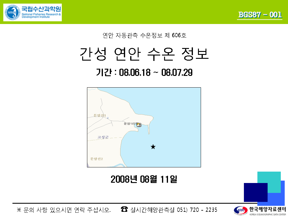 * 연안 자동관측 수온정보 제1호부터 제599호까지는 관련어업인들에게 우송하였습니다. * 클릭하면 선명하게 보입니다.