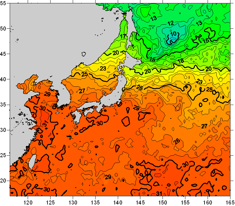 o 2008년 08월 14일 북서태평양 광역해양 수온분포 입니다. o 아래 위성 수온분포도는 국립수산과학원(NFRDI, Korea)과 일본동북대학교(Tohoku University, Japan)가 공동연구개발 진행중, 1차 연구결과인 것으로 구름의 영향을 배제한 신기술의 수온정보입니다.