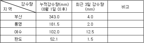 (Aug. 18. 2008) 2. 기상전망 (기상청 예보 자료) * 바람 및 파고 전망 오늘 남해서부에서 바람은 남서풍 내지 서풍이 10~14m/sec, 파고는 2.0~3.0m 내외로 예상되며, 남해동부에서는 남서풍 내지 서풍이 9~13m/sec, 파고는 1.5~2.5m로 예상됨. 내일은 남해서부에서 바람은 서풍 내지 북서풍이 8~12m/sec, 파고는 1.0~2.0m 내외로 예상되며, 남해동부에서 바람은 서풍 내지 북서풍이 9~13m/sec, 파고는 1.5~2.5m로 예상됨. * 특보 발효 현황 ㅇ 강풍주의보: 충청남도(아산시, 예산군, 태안군, 당진군, 서산시, 보령시, 서천군, 홍 성군), 흑산도홍도 ㅇ 강풍경보: 서해5도, 인천광역시 ㅇ 호우주의보: 경기도(동두천시, 연천군, 포천시, 의정부시), 강원도(철원군), 인천광역시 ㅇ 풍랑주의보: 서해전해상, 제주도남쪽먼바다 * 강수량