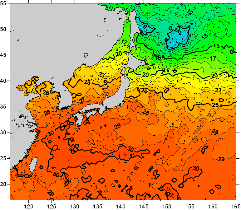 o 2008년 08월 18일 북서태평양 광역해양 수온분포 입니다. o 아래 위성 수온분포도는 국립수산과학원(NFRDI, Korea)과 일본동북대학교(Tohoku University, Japan)가 공동연구개발 진행중, 1차 연구결과인 것으로 구름의 영향을 배제한 신기술의 수온정보입니다.